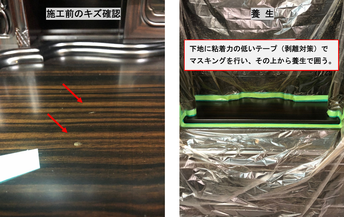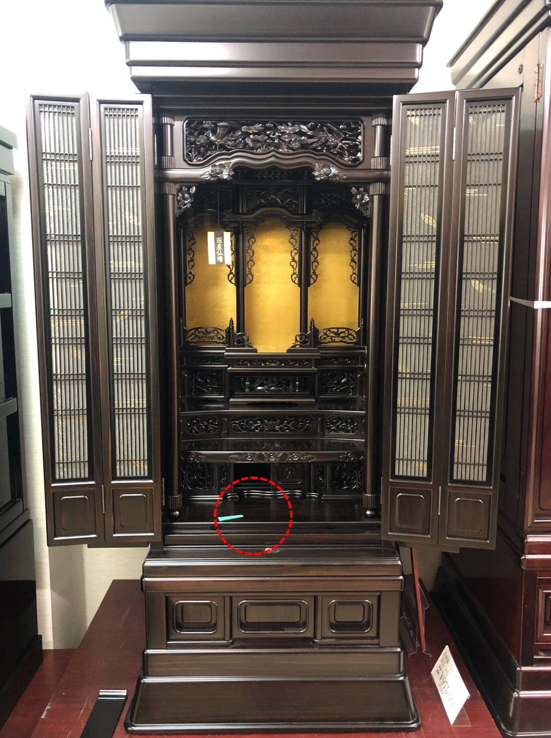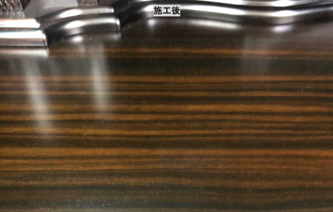 国産仏壇(黒檀)のキズ手直し 【不具合状況】:ヘコミキズ 【不具合状況】:ヘコミキズ 金物を落して、へこんでしまったそうです。へこみ部分に特殊な樹脂を埋め、表面を平らに成形。細い筆を使い色合せと木目を描き込み周囲と馴染ませます。黒檀特有の艶を確認しながら合わせ、仕上げに手触りを整えたら完成です。