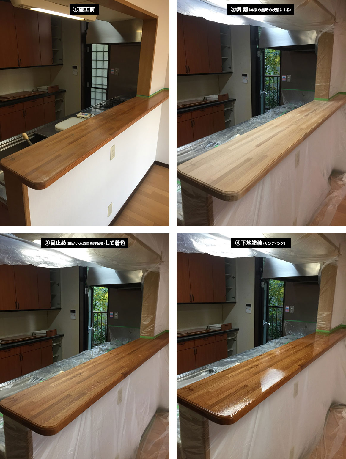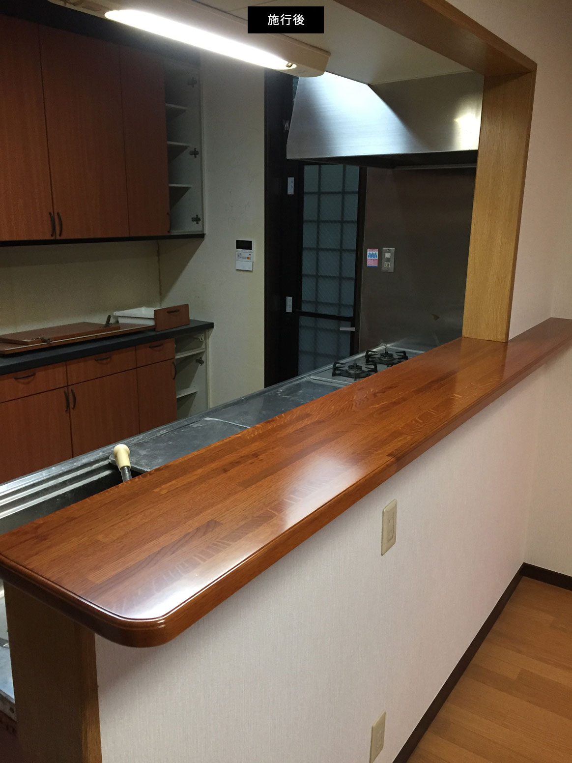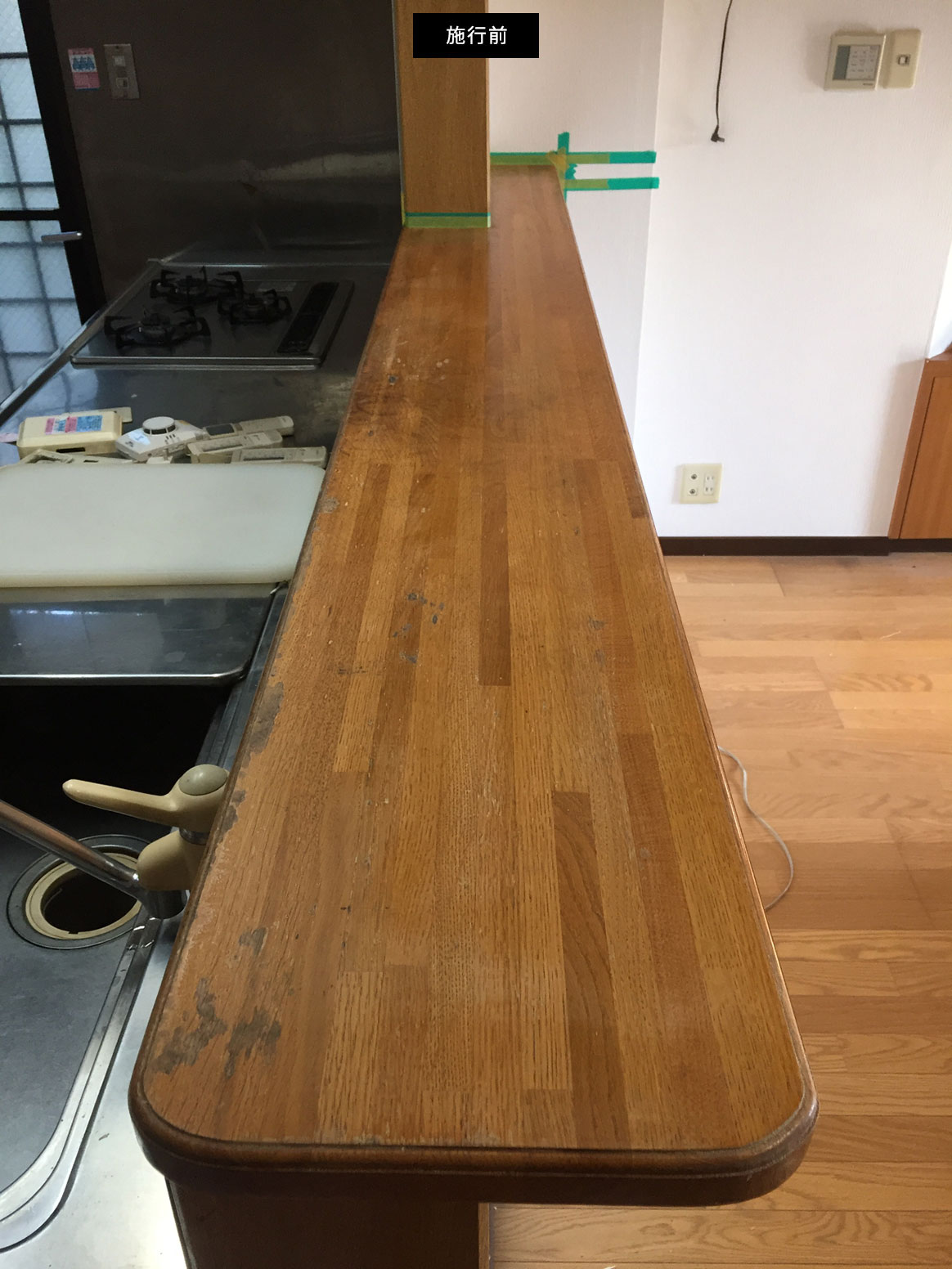 一般住宅 キッチンカウンターの塗り替え リフォームの為、経年劣化したカウンターを塗り替え ※目止めとは、木を削ると目が粗くなるので、との粉を塗って埋めること ⑤下地乾燥後、更に表面を研磨し、ウレタンクリア塗装(7分艶消し)で仕上げて完成