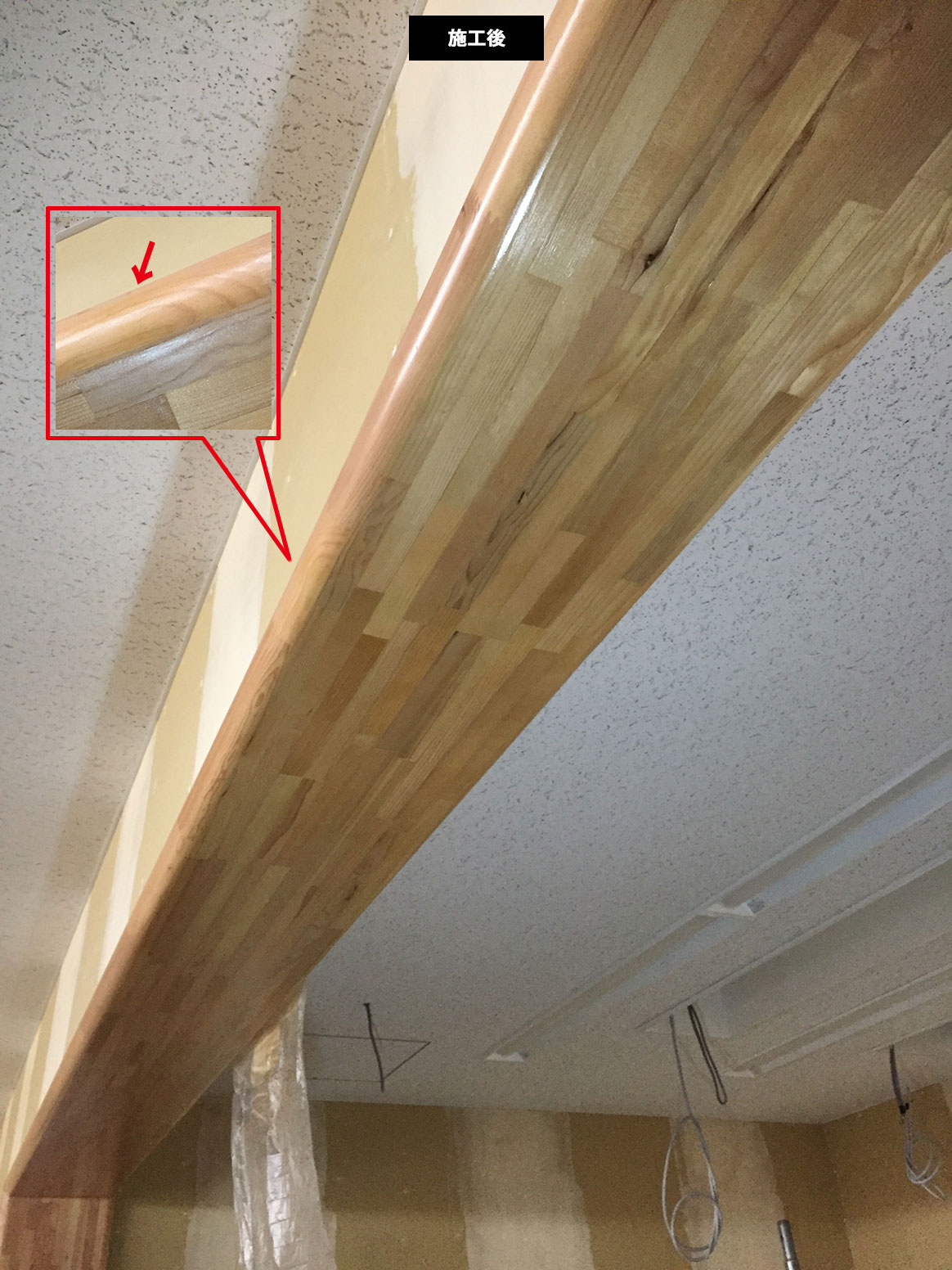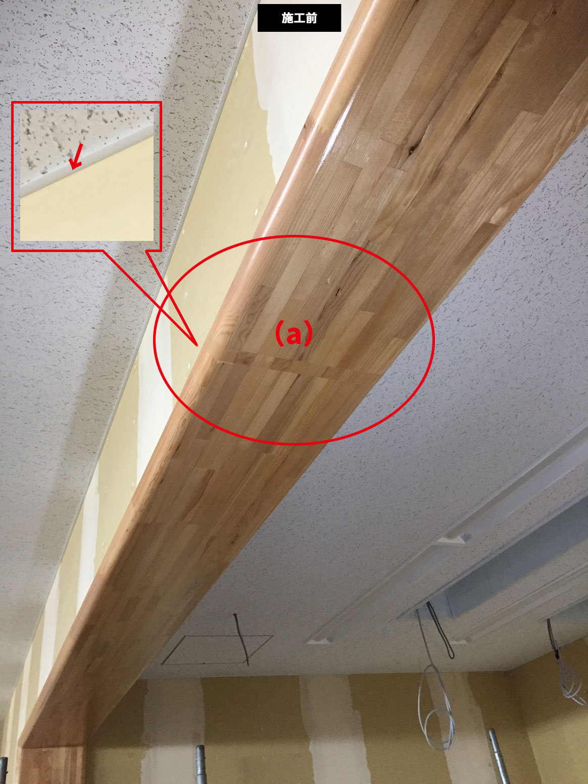 寸法が短かったので、継ぎ足したのですが(a)、元請け様より見た目が悪い『造り直し』との指示。 天井が高く作業用の足場が敷き詰めてあるのですが、解体の日程が迫っている為、造り直すには厳しい状況だそうで、この継ぎ足した部分を目立たなくして欲しいと言うご依頼。 両横のアール面を含めると、長さ380mm