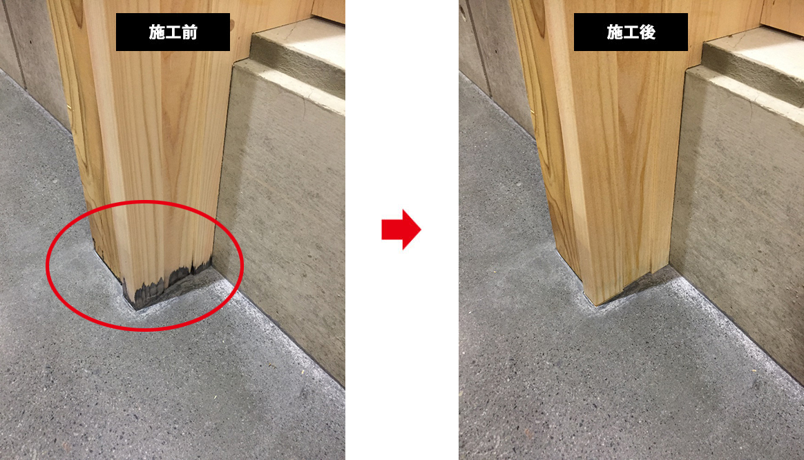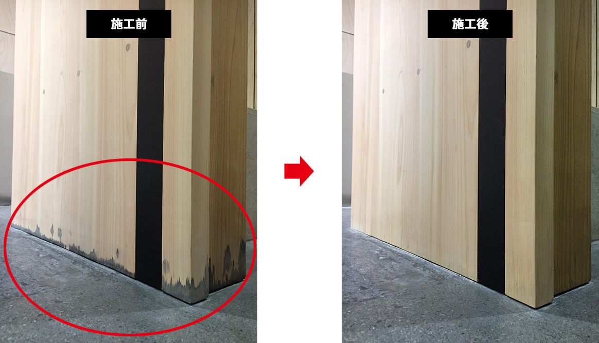工業施設 木材への色移り 【不具合状況】:色移り 木材に染み込んだ色は、削っても、染み取りを使っても取れません。この上に色を塗るしか無さそうです。 見た目の違和感が無いよう自然な質感を再現し、木目は筆を使って描き込みました。確認検査も合格です。