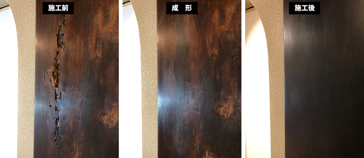 『酷い虫食いあと』のため、強度を考えて特殊な樹脂を流し込んで固めます。