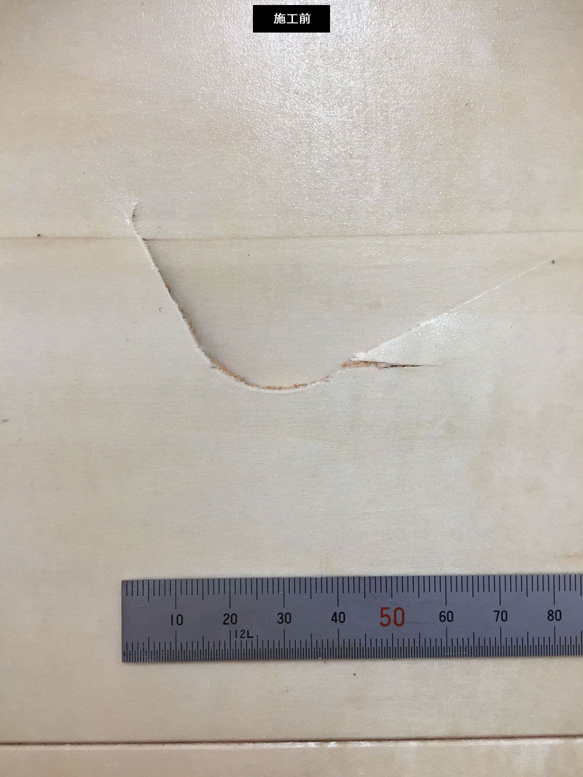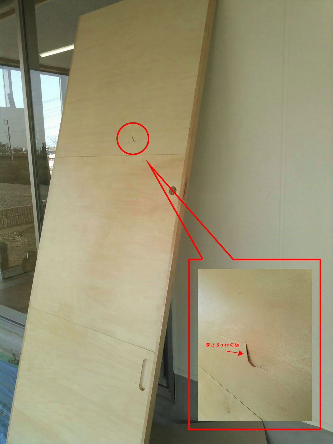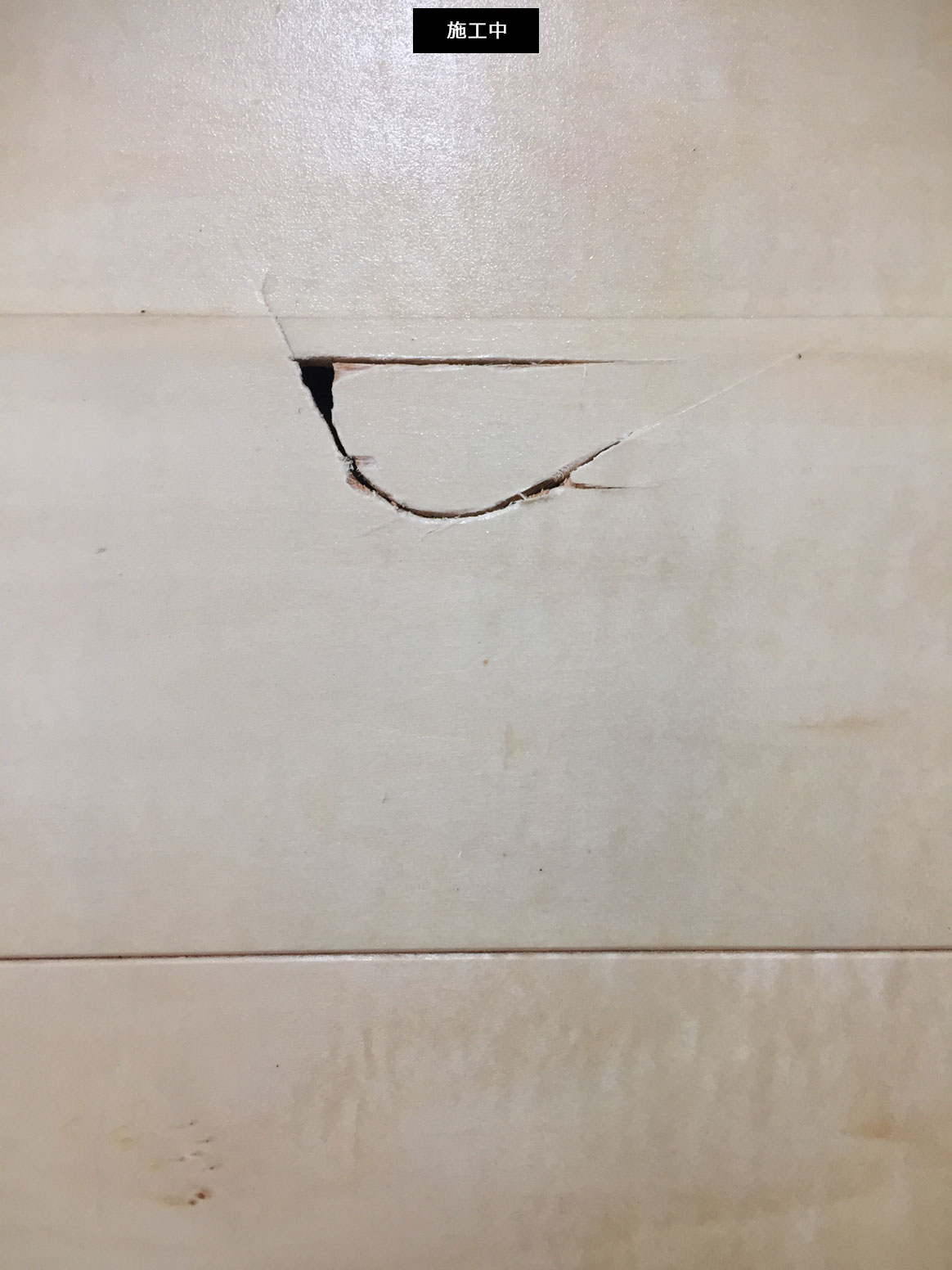 【不具合状況】:建具(H2485mm×W895mm)が倒れて陥没したキズ