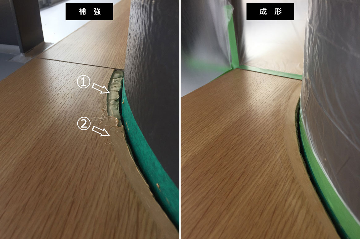 ①硬質の充填材を埋めて補強。 ②特殊な樹脂で平らな表面を成形。