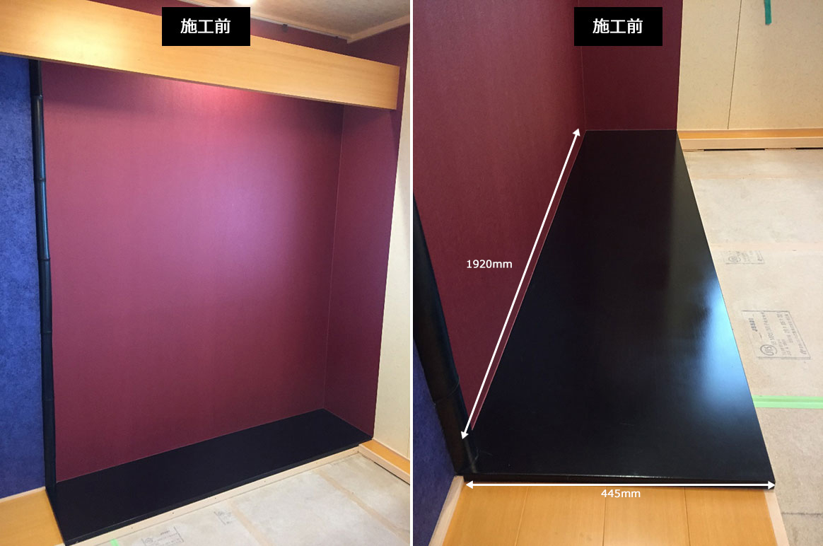 カシュー塗りの床(とこ)板です。光沢のある黒は、養生や雑巾拭きなどを安易に行うと細かいキズが無数に付きます。