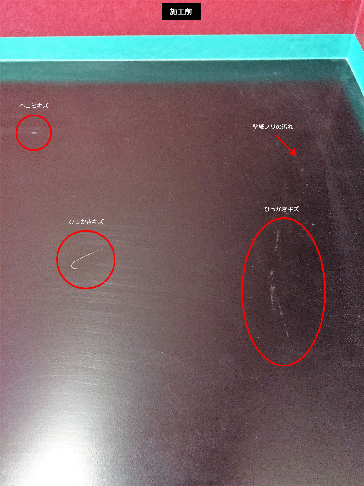 養生によるスリキズ、クリーニングによる拭きキズなら研ぎ出しをしてキズを整え、磨きをすれば、より美しいし仕上がりに出来ます。ですが、ヘコミキズ、ひっかきキズがあるため補修をしての塗り直しが必要になりました。