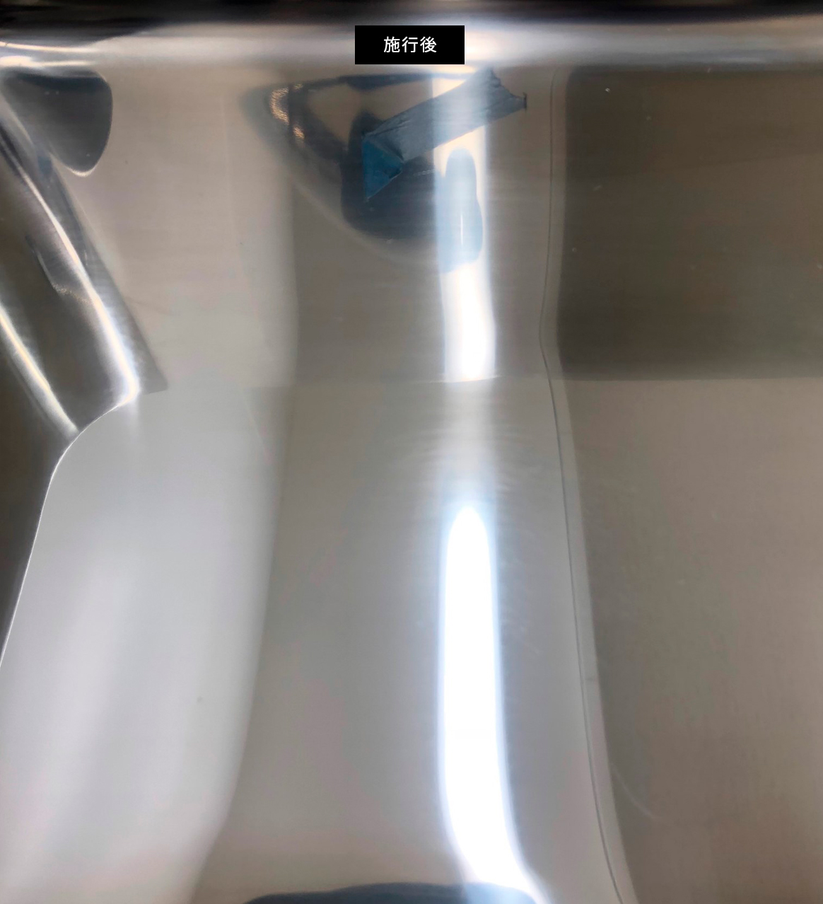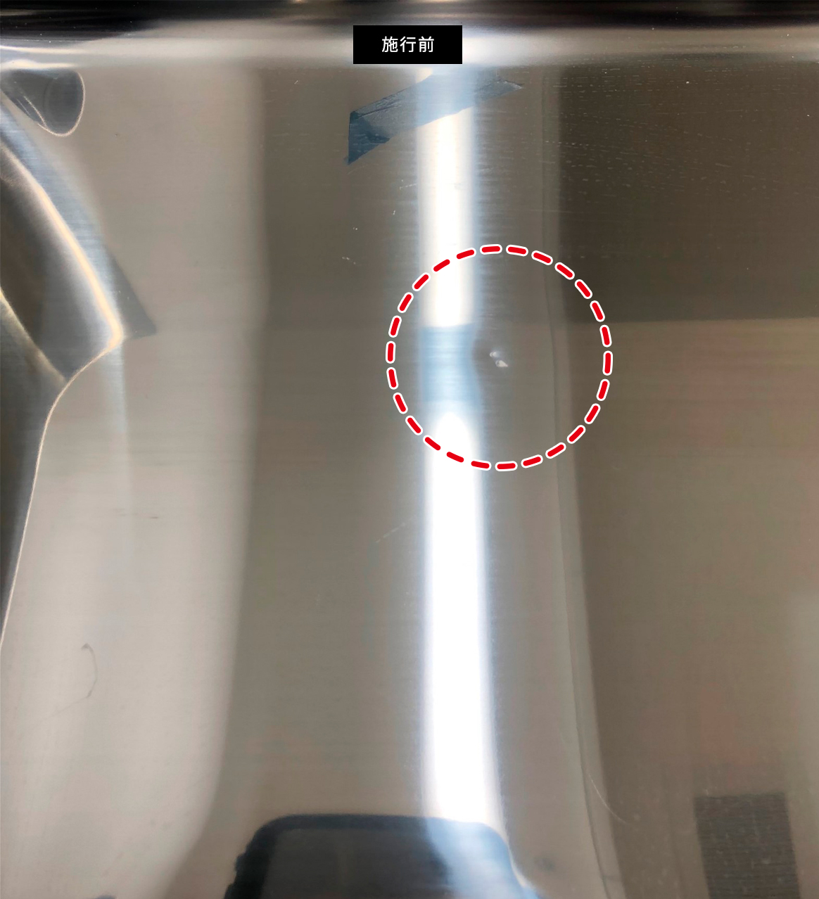 医療用ステンレスシンクのヘコミキズ 【不具合状況】:落下物によるステンレスシンクのヘコミキズ 医療用は、ステンレスの板が厚いため住宅用とくらべると硬いです。 また、映り込むほどの光沢仕上げではありますが、ヘアライン(スジ)も入っている。 慎重に引っぱり出しを行い、細やかな調整をして磨き作業を行います。 映り込みのある光沢仕上げでしたが、ポリッシャーを駆使して綺麗に再現できました。