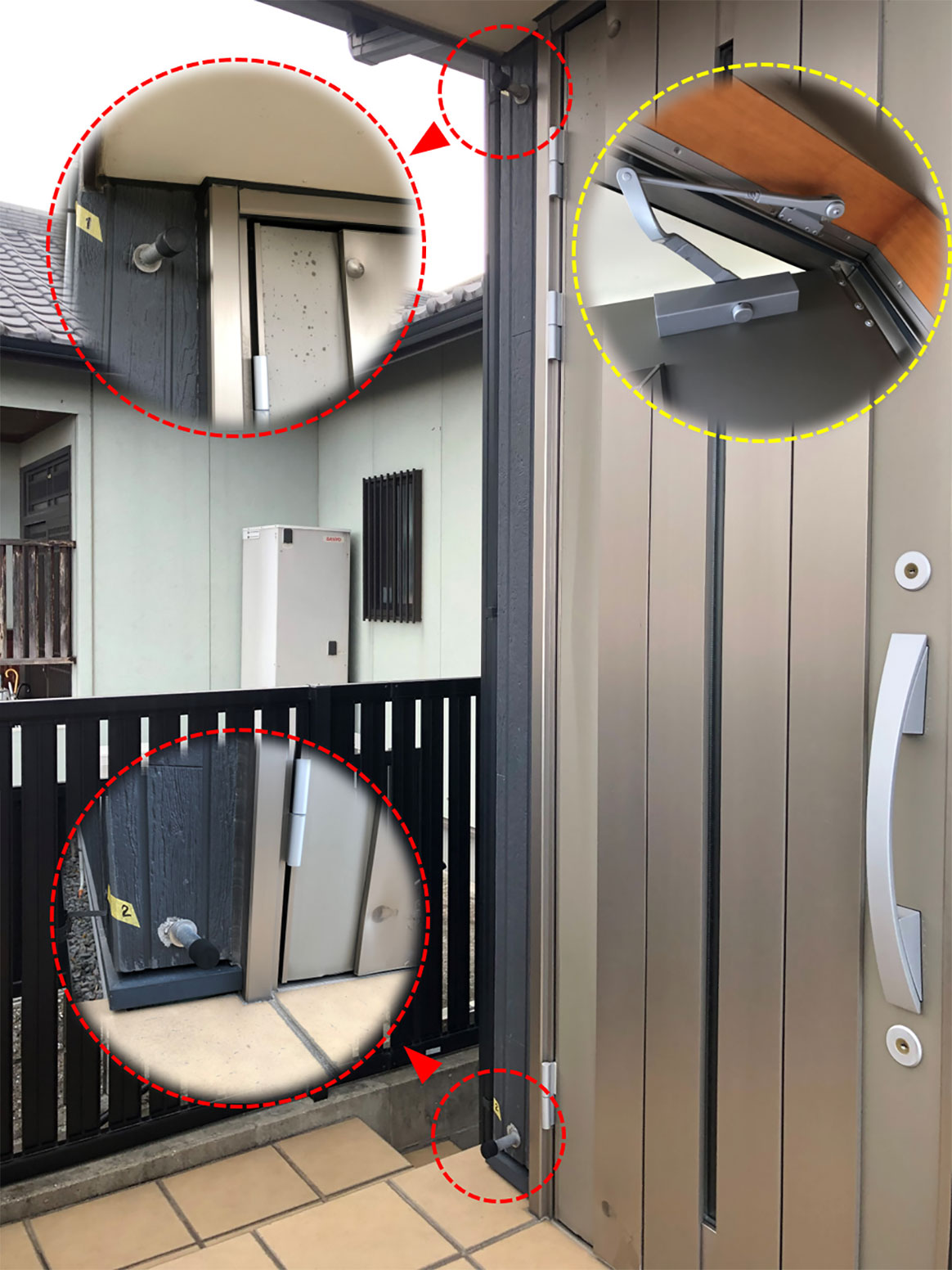 突風の勢いで扉が持っていかれ、ドアストッパーに激しく衝突。