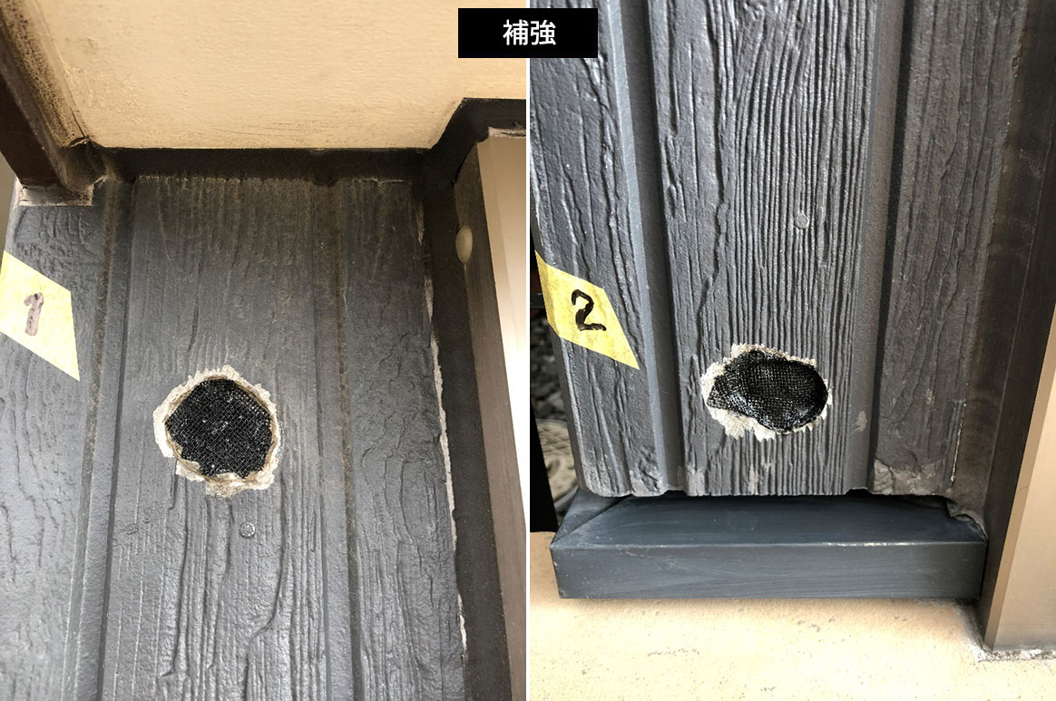 壊れたものは取り除き削って形を整えます。補強に重点を置きガラス繊維を貼り重ねて補強。その後、硬質の充填材を埋めて実用強度を持たせます。