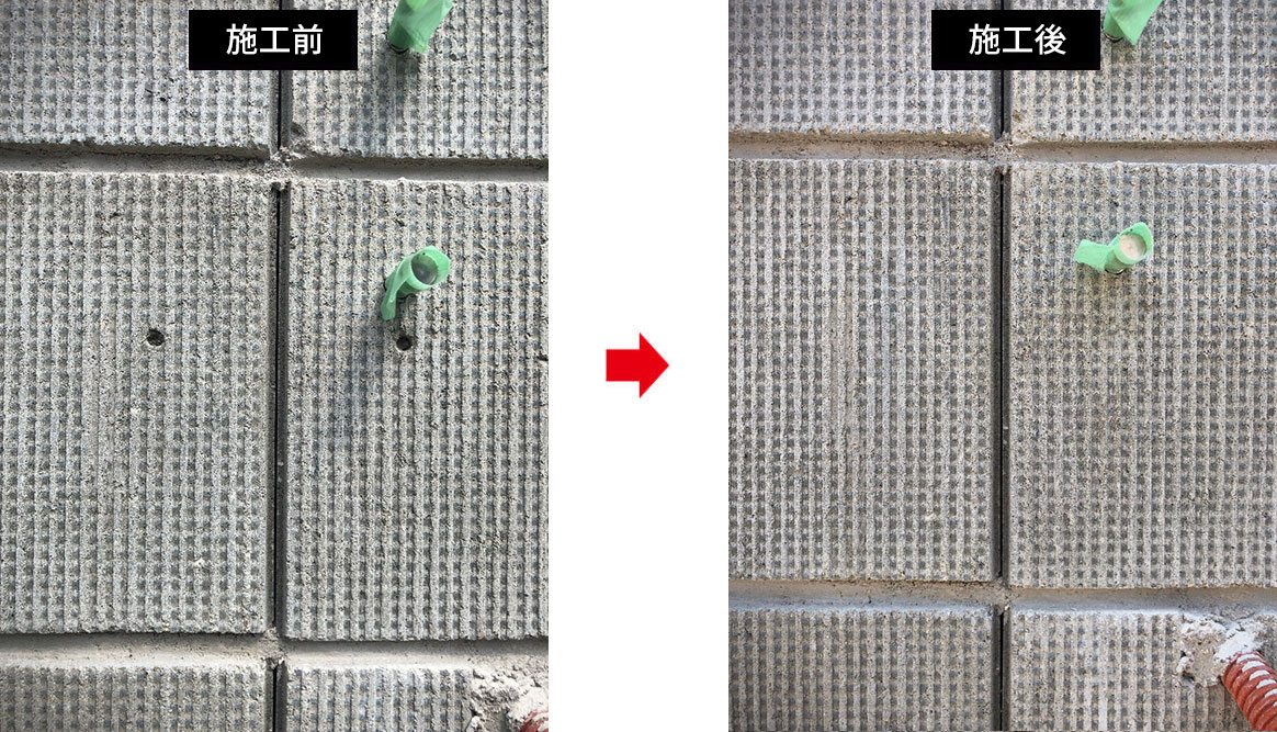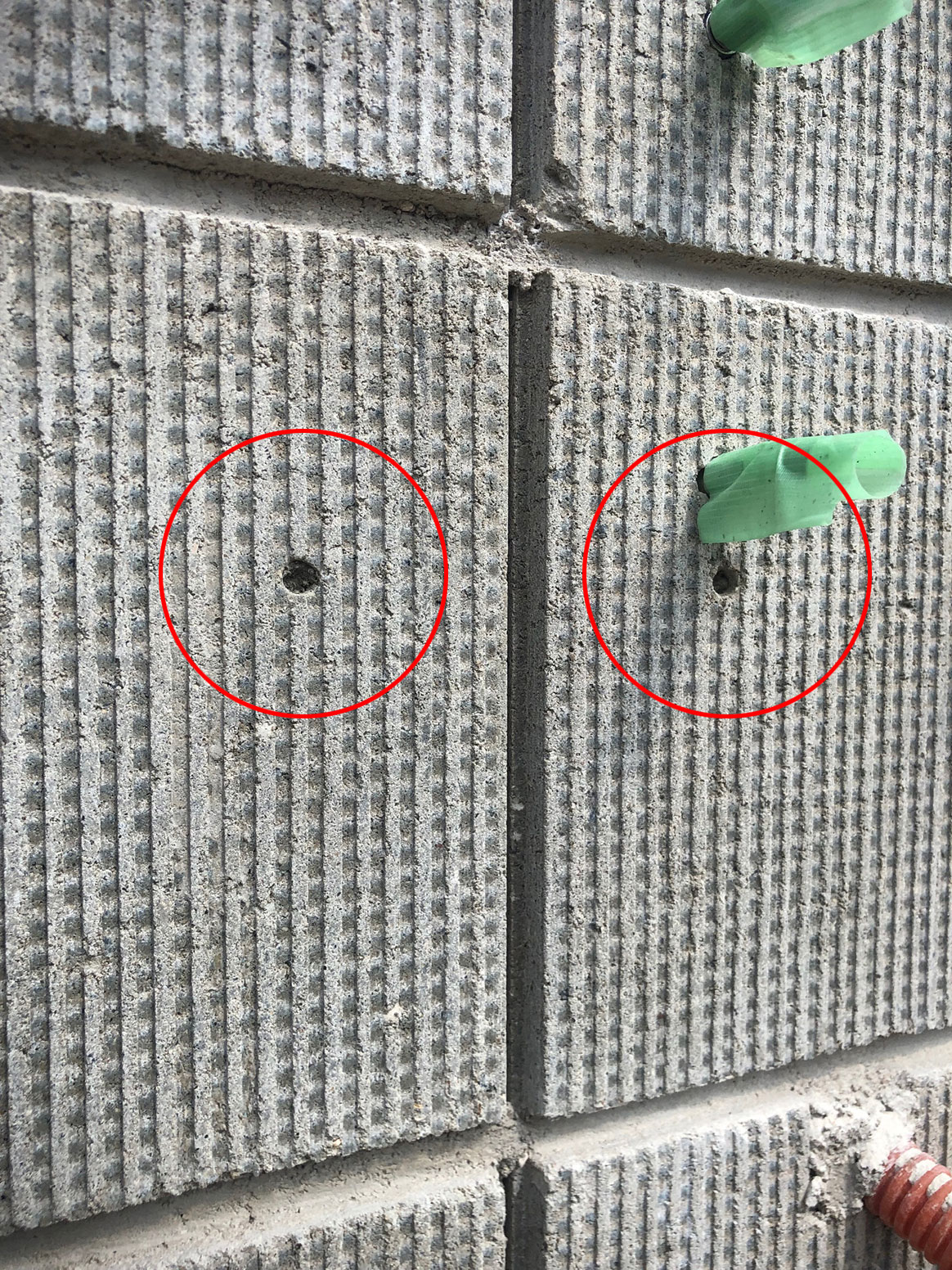 一般住宅 取り付け穴の開け間違い 【不具合状況】:取り付け穴の開け間違い 表札を取り付けるため、化粧ブロックにドリルで穴を開けたところ 位置を間違えてしまったそうです。 マス目状の立体模様に薄い緑色のアクセントが入った化粧ブロックです。強度を持たせるため、コンクリートに適した充填材で埋めて硬化させブロックの立体模様を成形。アクセントの緑色を合わせて、ザラザラとした質感も復元して馴染ませました。確認検査も合格です。