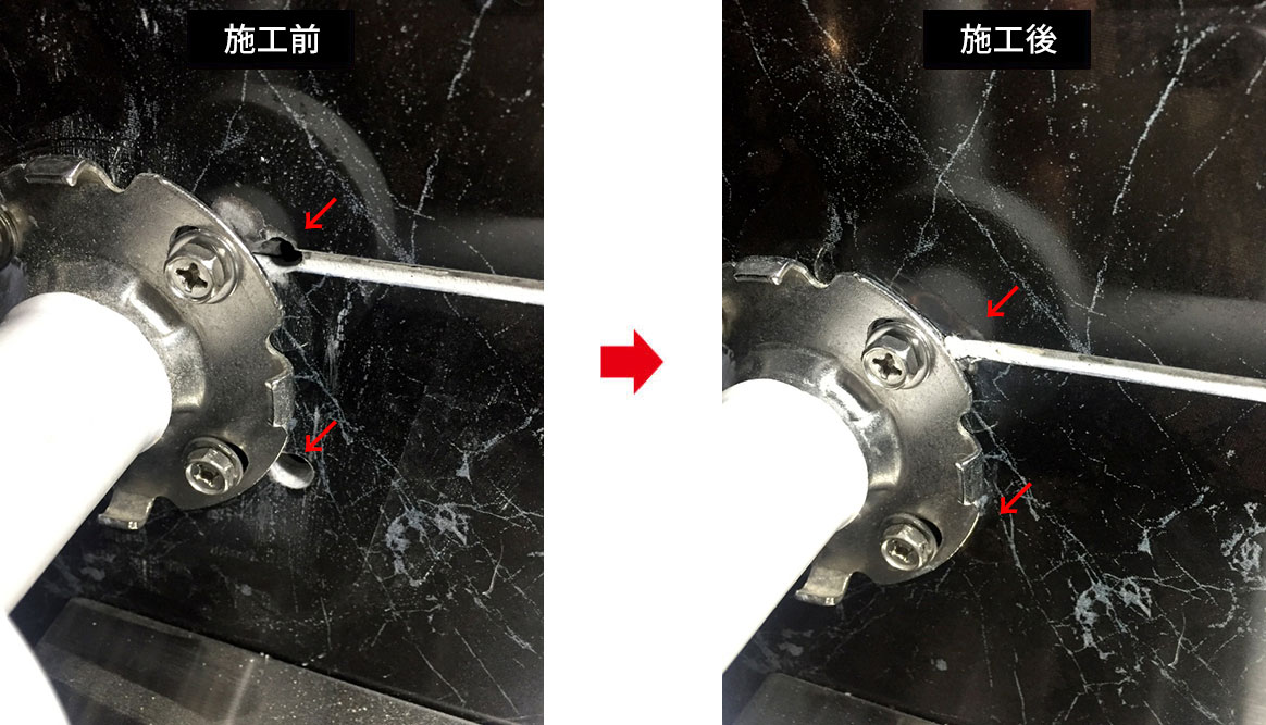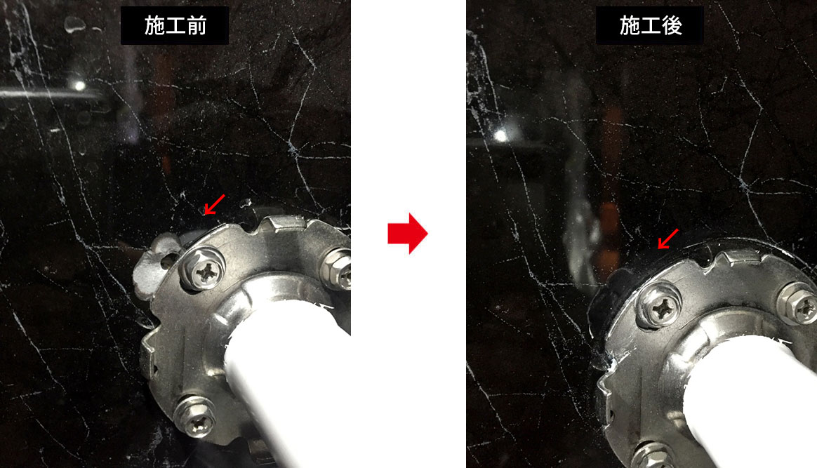 商業施設 大理石の穴あけ間違い 【不具合状況】:穴あけ間違い ネロクラウン(本磨き)、光沢のある大理石です。硬質の充填材を埋めて固め、下地処理をする。 筆を使い色合わせと石目柄を再現。表面に樹脂を重ねて保護して光沢仕上げにしました。